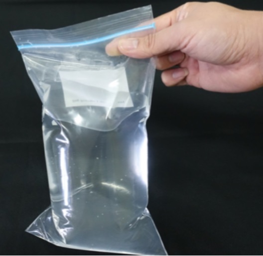 3. เก็บตัวอย่างน้ำใส่ถุงปราศจากเชื้อ 1 ให้ได้ประมาณ 2/3 ของถุง ปิดปากถุงให้สนิท แล้วทำการทดสอบทันที