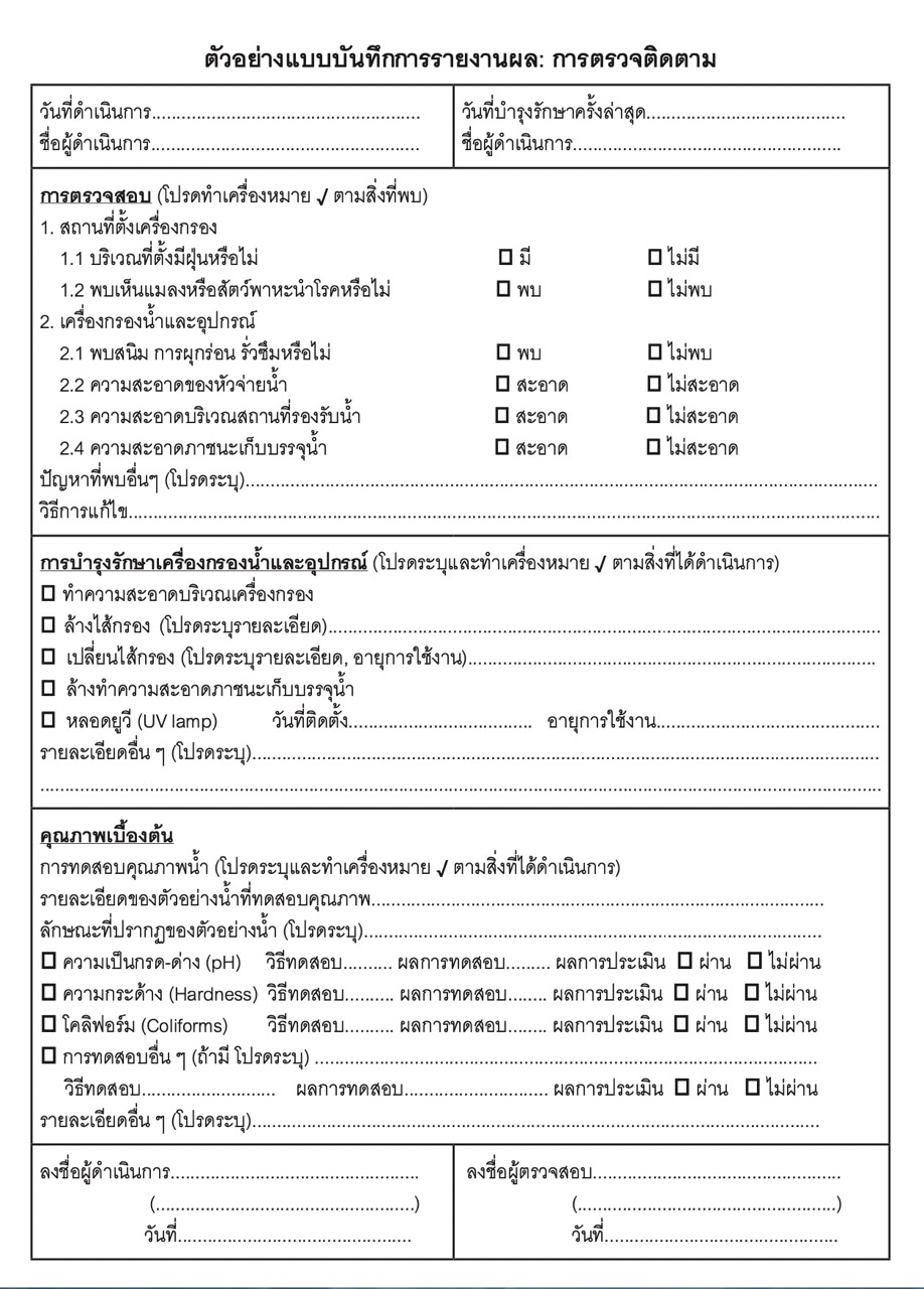 - เครื่องกรองน้ำ มีการทำความสะอาดและการดูแลรักษา เช่น ล้างทำความสะอาด เปลี่ยนไส้กรองตามระยะเวลาที่เหมาะสม