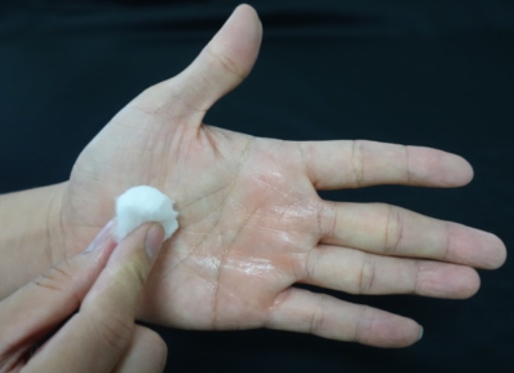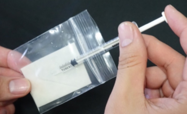 3. ดูดตัวอย่างน้ำ 1 มิลลิลิตร (1 ml) แล้วฉีดลงบนกระดาษทดสอบโดยให้ปลายหลอดฉีดยาแตะถูกกระดาษทดสอบ (ระวังอย่าให้มือแตะกระดาษทดสอบ)