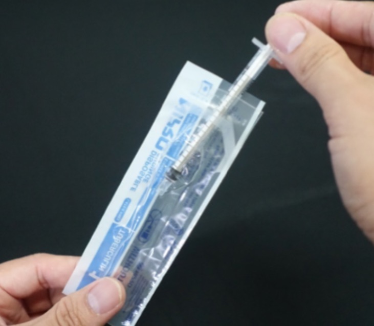 2. ฉีกซองหลอดฉีดยาตรงรอยฉีกแล้วดึงหลอดฉีดยาออกจากซอง (ระวังการปนเปื้อนจากเชื้อภายนอก อย่าให้ส่วนล่างของหลอดฉีดยาสัมผัสกับมือผู้ตรวจสอบหรือสิ่งอื่นๆ)