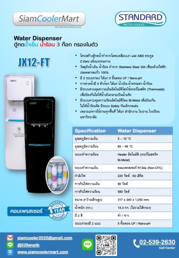 ตู้ทำน้ำเย็น Standard JX12-FT เป็นตู้กดน้ำ 3 ก๊อกที่สามารถ เลือกระบบกรองได้ 2 แบบ ได้แก่ UF และ Nano-pH เหมาะสำหรับทั้งบ้าน ออฟฟิศ โรงงาน และโรงเรียน หากคุณต้องการน้ำดื่มที่ สะอาด ปลอดภัย และดีต่อสุขภาพ รุ่นนี้คือคำตอบที่ครบจบในเครื่องเดียว