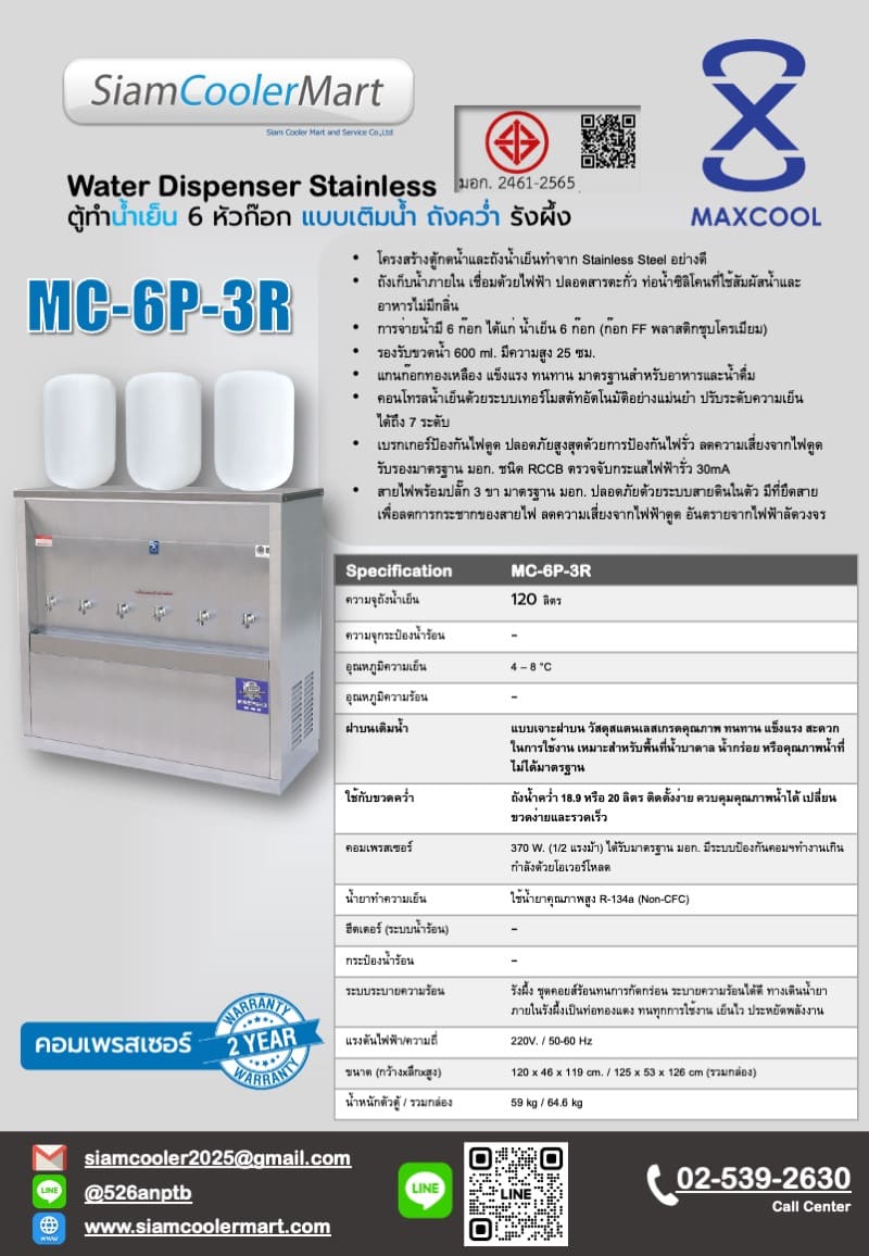 เครื่องกดน้ำเย็น 6 ก๊อก แบบเติมน้ำ รังผึ้ง ยี่ห้อ Maxcool MC-6P-3R