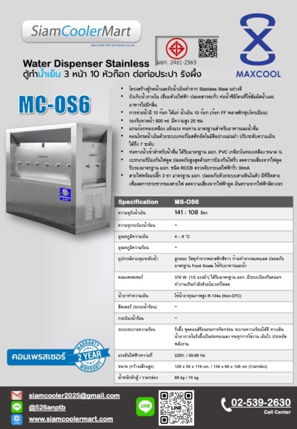 เครื่องทำน้ำเย็น 3 หน้า 10 ก๊อก ต่อท่อประปา รังผึ้ง ยี่ห้อ Maxcool MC-OS6