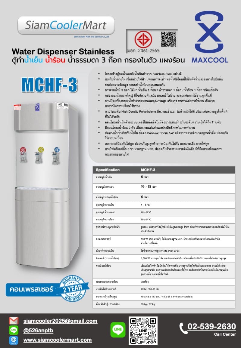 ตู้กดน้ำเย็น-น้ำร้อน-น้ำธรรมดา 3 ก๊อก Maxcool MCHF-3 กรองในตัว แผงร้อน