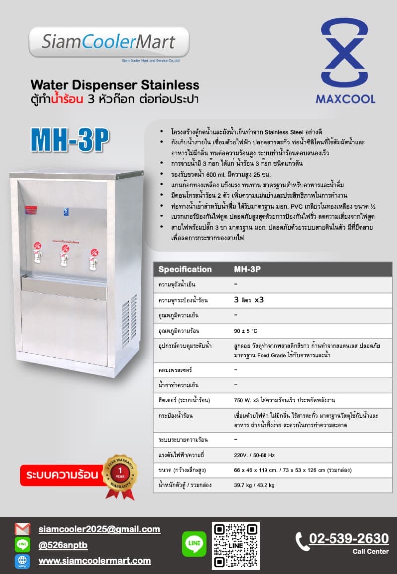 ตู้น้ำร้อน 3 ก๊อก ต่อท่อประปา สแตนเลส Maxcool MH-3P
