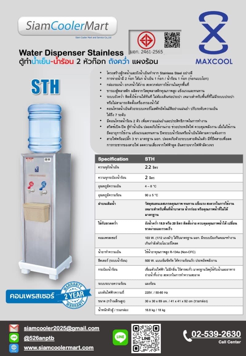 ตู้ทำน้ำเย็น-น้ำร้อน 2 ก๊อก Maxcool STH ถังคว่ำ แผงร้อน