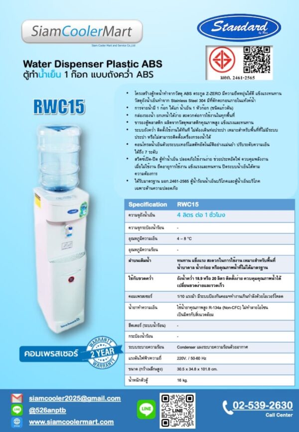 3.1 ส่งอย่างเดียวโดยการใช้บริการขนส่ง ค่าขนส่งขึ้นอยู่กับระยะทางและน้ำหนักสินค้า จ่ายต้นทางหรือปลายทางขึ้นอยู่กับการตกลง หมายเหตุ : ทางเราไม่ได้มีบริการติดตั้งทุกจังหวัดทั่วประเทศไทย เช่น ภาคเหนือ ภาคใต้ ทางเราไม่มีบริการติดตั้ง ขึ้นอยู่กับระยะทางและปริมาณการซื้อขาย สามารถทักมาสอบถามพูดคุยเบื้องต้นก่อนได้ตามช่องทางการติดต่อด้านล่าง Siamcooler Mart and Service ยินดีให้คำปรึกษาและให้บริการอย่างเต็มความสามารถเพื่อช่วยลูกค้าแก้ปัญหา เปรียบเสมือนแผนกหนึ่งในองค์กรที่ช่วยดูแลเรื่องตู้กดน้ำ ไส้กรองน้ำ เครื่องกรองน้ำ อะไหล่ และบริการบำรุงรักษา เช่น การล้างทำความสะอาด การซ่อมบำรุง การทำสัญญาบริการรายปี ประสบการณ์กว่า 20 ปี มีฐานลูกค้ามากกว่า 6,000 ราย ได้รับความไว้วางใจจากภาครัฐ เอกชน โรงเรียน ครัวเรือน และขยายฐานลูกค้าอย่างต่อเนื่อง จากการบอกต่อของลูกค้าที่ประทับใจในการใช้บริการกับเรา สามารถชื่นชมผลงานที่ผ่านมาของเราได้ที่นี่คู่มือใช้งาน เครื่องทำน้ำเย็น ถังคว่ำ RWC15 สแตนดาร์ด