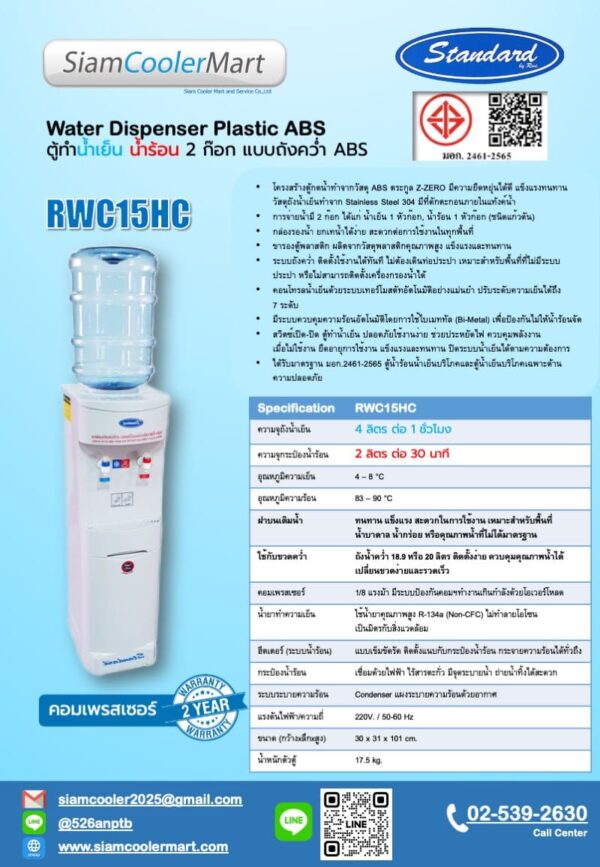 3.1 ส่งอย่างเดียวโดยการใช้บริการขนส่ง ค่าขนส่งขึ้นอยู่กับระยะทางและน้ำหนักสินค้า จ่ายต้นทางหรือปลายทางขึ้นอยู่กับการตกลง หมายเหตุ : ทางเราไม่ได้มีบริการติดตั้งทุกจังหวัดทั่วประเทศไทย เช่น ภาคเหนือ ภาคใต้ ทางเราไม่มีบริการติดตั้ง ขึ้นอยู่กับระยะทางและปริมาณการซื้อขาย สามารถทักมาสอบถามพูดคุยเบื้องต้นก่อนได้ตามช่องทางการติดต่อด้านล่าง Siamcooler Mart and Service ยินดีให้คำปรึกษาและให้บริการอย่างเต็มความสามารถเพื่อช่วยลูกค้าแก้ปัญหา เปรียบเสมือนแผนกหนึ่งในองค์กรที่ช่วยดูแลเรื่องตู้กดน้ำ ไส้กรองน้ำ เครื่องกรองน้ำ อะไหล่ และบริการบำรุงรักษา เช่น การล้างทำความสะอาด การซ่อมบำรุง การทำสัญญาบริการรายปี ประสบการณ์กว่า 20 ปี มีฐานลูกค้ามากกว่า 6,000 ราย ได้รับความไว้วางใจจากภาครัฐ เอกชน โรงเรียน ครัวเรือน และขยายฐานลูกค้าอย่างต่อเนื่อง จากการบอกต่อของลูกค้าที่ประทับใจในการใช้บริการกับเรา สามารถชื่นชมผลงานที่ผ่านมาของเราได้ที่นี่คู่มือการใช้งาน เครื่องทำน้ำเย็น RWC15HC สแตนดาร์ด