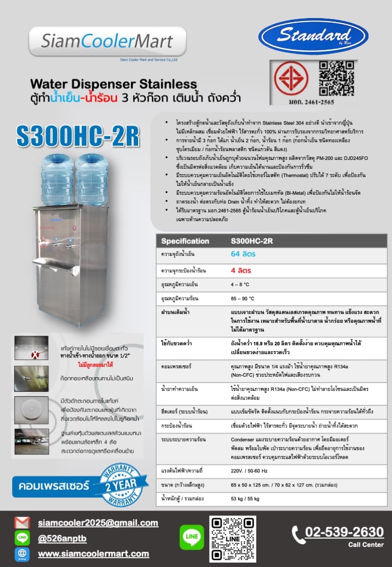 เครื่องทำน้ำเย็น-น้ำร้อน เจาะรูคว่ำถัง 3 ก๊อก Standard S300HC-2R